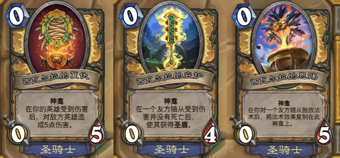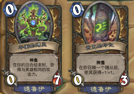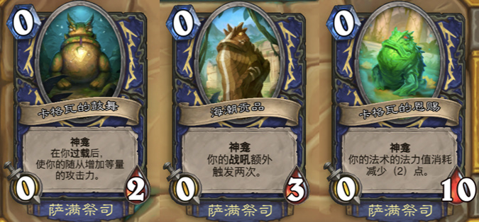 萨满的神龛效果应该说是最迥异,第一个针对萨满的过载机制产生效果,铺场一波过载很强但血量太低效果很难打出完美combo。第二个是针对战吼萨产生效果,看起来很强但还是容易嗝屁。第三个都针对新版本官推的法术萨,看上去真的很完美但实战很容易打空手牌,所以在选牌的时候需要注意。