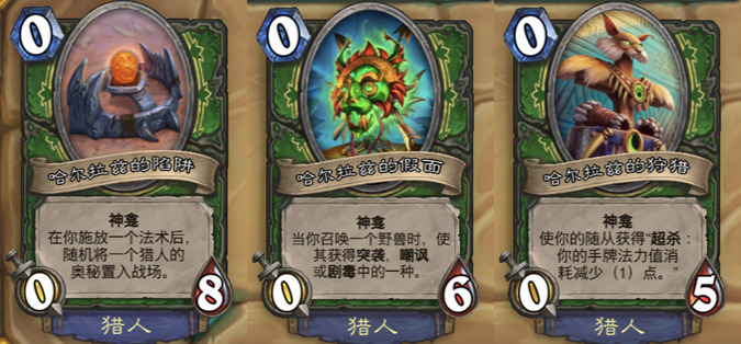 作为一个攻击性非常强的职业,猎人的神龛还是偏向于进攻。第一个让对手猜奥秘猜到头疼,第二个让野兽随从上场就有作用,第三个虽说“超神”有点难以触发,但触发之后的收益还是比较大。