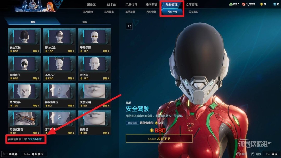 解限机中驾驶员的发型可以在【后勤管理】-【限时外观】中购买,此处商店中出售的商品是随机刷新的,左下角可以看到刷新倒计时(现实时间)。