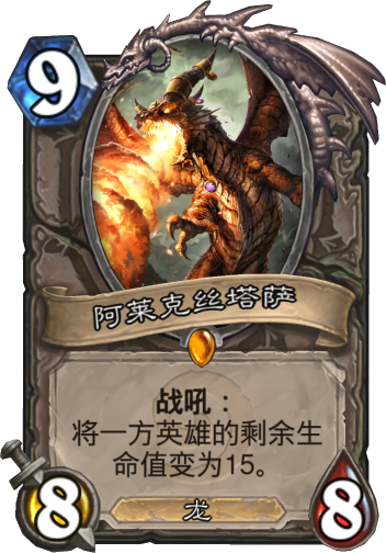 阿莱克丝塔萨是魔兽世界里的红龙女王,生命束缚者,而在炉石传说里可以将英雄血量强制变为十五,不管是敌方还是我方。阿莱克丝塔萨的战吼可以用来关键时刻恢复自己血量,避免被敌人一套带走,也可以用来将对面血量变为十五,准备在下个回合斩杀敌人,在寒冰屏障没有进荣誉室时,这两张卡牌可以形成相当默契的配合,敌人只能乖乖投降。