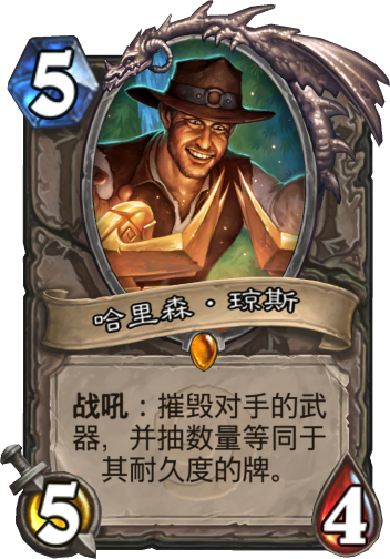 哈里森琼斯是一张环境卡,他的作用就是用来针对那些武器卡牌,如果当前环境中,使用武器的职业出场率高的话,哈里森琼斯的出场率也会随之上升。哈里森琼斯跟二费的酸性沼泽软泥怪相比,虽然费用高了很多,灵活度也差了很多,身材还亏了一费,但是哈里森琼斯只要摧毁了武器,就能根据耐久值抽取同样数值的卡牌,基本上抽个一张就已经超模了。