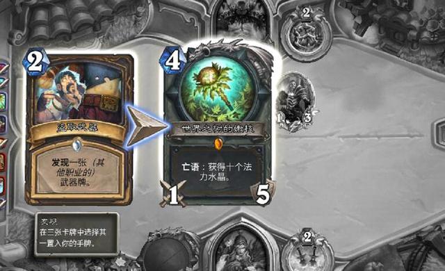 1.盗取武器并不是看起来那么不堪,武器虽然繁多但优质占绝大部分,在加上盗取武器的T位较低是一张可选的牌,有着致胜的上限,比如下图找世界嫩枝翻盘。