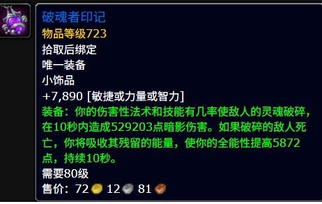 装备:你的伤害性法术和技能有几率使敌人的灵魂破碎在10秒内造成529203点暗影伤害。如果破碎的敌人死亡,你将吸收其残留的能量,使你的全能性提高5872点,持续10秒。