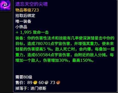 装备:你的伤害性法术和技能有几率使深渊彗星击中你的目标,造成780701点宇宙伤害,并增强其重力,使未来彗星的伤害提高5 %。敌人死亡时,会内爆,每叠加一层重力,造成650584点宇宙伤害,由附近的敌人分摊。每增加一个敌人,伤害增加30%,最高150%。