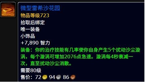 装备:你的治疗技能有几率使你自身产生5个扰动沙尘漩涡,每个漩涡可增加2076点急速。漩涡每4秒衰减一次,直至扰动沙尘消散。
