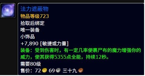 装备:受到伤害时,有一定几率使裹尸布的魔力增强你的威力,使其获得5355点全能,持续12秒。