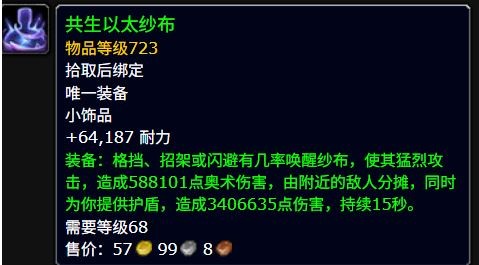 装备:格挡、招架或闪避有几率唤醒纱布,使其猛烈攻击,造成588101点奥术伤害,由附近的敌人分摊,同时为你提供护盾,造成3406635点伤害,持续15秒。