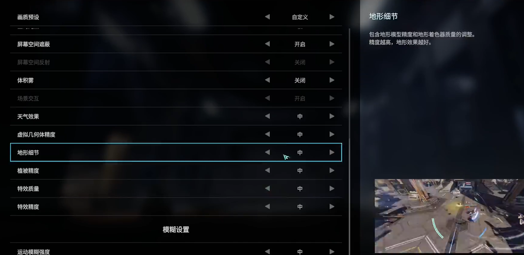 「体积雾」关掉、「天气效果」、「虚拟几何精度」「地形细节」、「植被精度」、「特效质量」、「特效精度」都调成中。