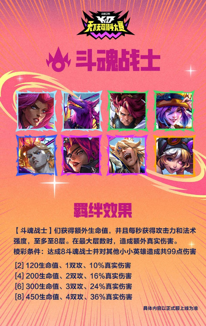 云顶之弈S15版本天下无双格斗大赛主题PBE美测服更新了,在新赛季会增加很多新的羁绊和棋子,还有不少老羁绊,老英雄的回归,那么有不少小伙伴好奇都有哪些羁绊效果,下面就给大家带来s15斗魂战士羁绊效果一览。