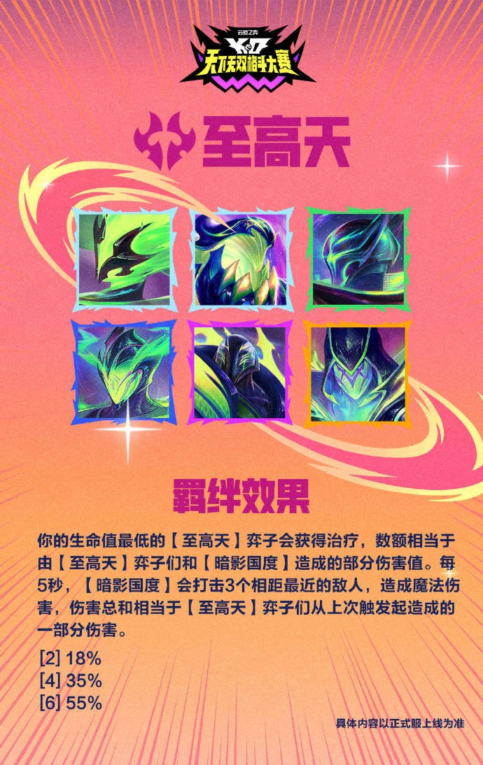 云顶之弈S15版本天下无双格斗大赛主题PBE美测服更新了,在新赛季会增加很多新的羁绊和棋子,还有不少老羁绊,老英雄的回归,那么有不少小伙伴好奇都有哪些羁绊效果,下面就给大家带来s15至高天羁绊效果一览。