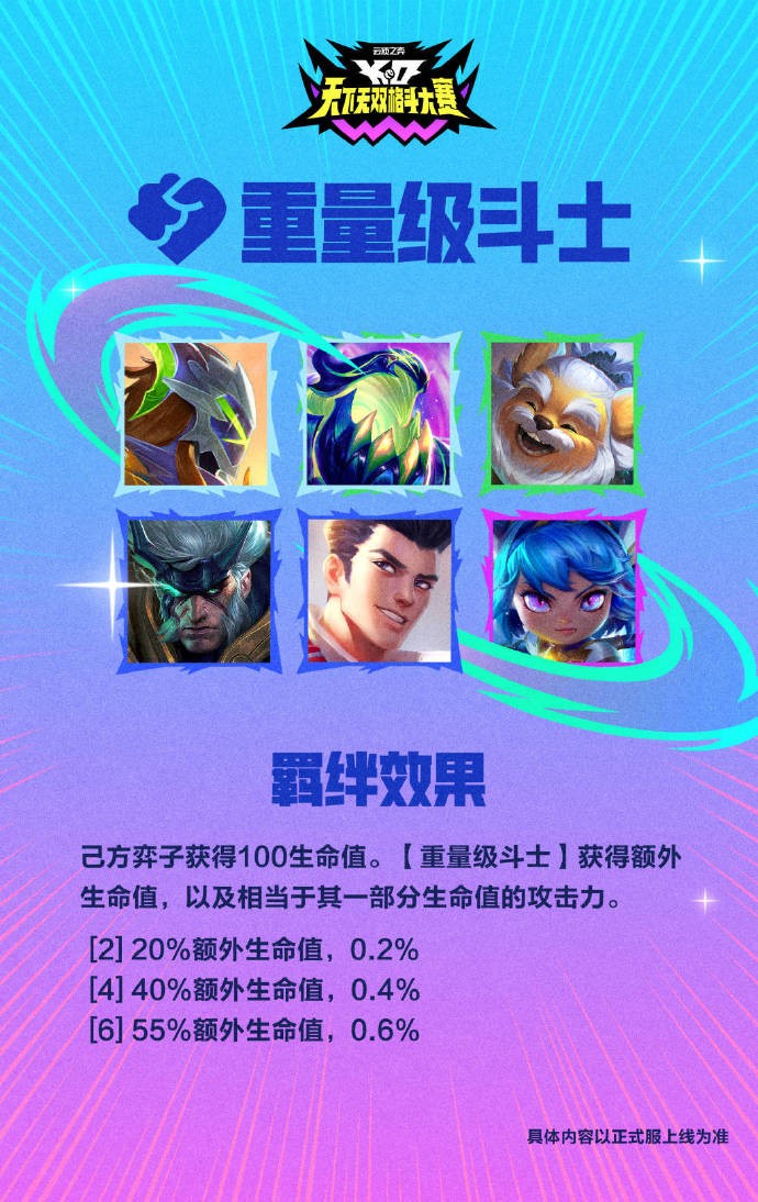 云顶之弈S15版本天下无双格斗大赛主题PBE美测服更新了,在新赛季会增加很多新的羁绊和棋子,还有不少老羁绊,老英雄的回归,那么有不少小伙伴好奇都有哪些羁绊效果,下面就给大家带来s15重量级斗士羁绊效果一览。