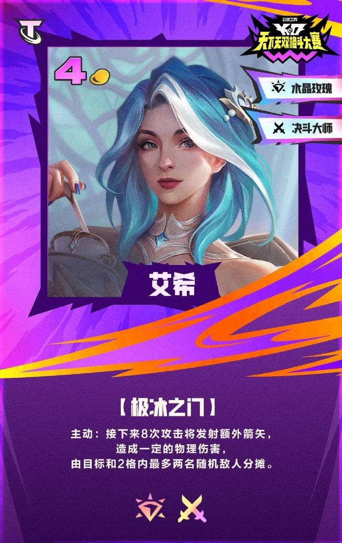 云顶之弈S15版本天下无双格斗大赛主题PBE美测服更新了,在新赛季会增加很多新的羁绊和棋子,还有不少老羁绊,老英雄的回归,那么有不少小伙伴好奇各个英雄的技能是什么,下面就给大家带来s15艾希羁绊效果一览。