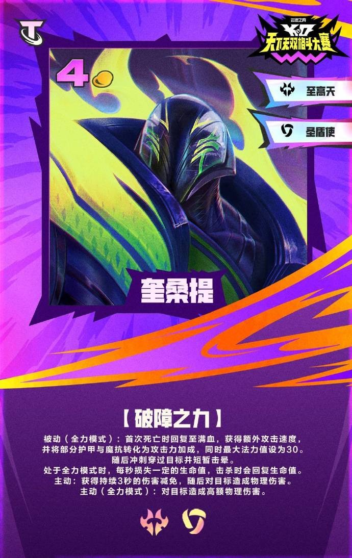 被动(全力模式):首次死亡时回复至满血,获得额外攻击速度井将部分护用与魔抗转化为攻击力加成,同时最大法力值设为30。随后冲刺穿过目标并短暂击晕。处于全力模式时,每秒损失一定的生命值,击杀时会回复生命值。