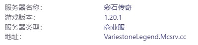 我的世界里面有很多的服务器,每个服务器都有自己的独特的玩法,今天给大家带来的服务器的名字叫:彩石传奇,那么下面就是这个服务器的一个具体的IP地址.