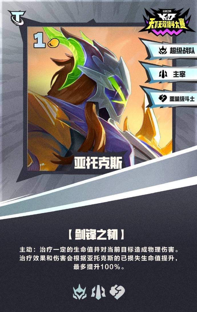 云顶之弈S15版本天下无双格斗大赛主题PBE美测服更新了,在新赛季会增加很多新的羁绊和棋子,还有不少老羁绊,老英雄的回归,那么有不少小伙伴好奇各个英雄的技能是什么,下面就给大家带来s15亚托克斯羁绊效果一览。