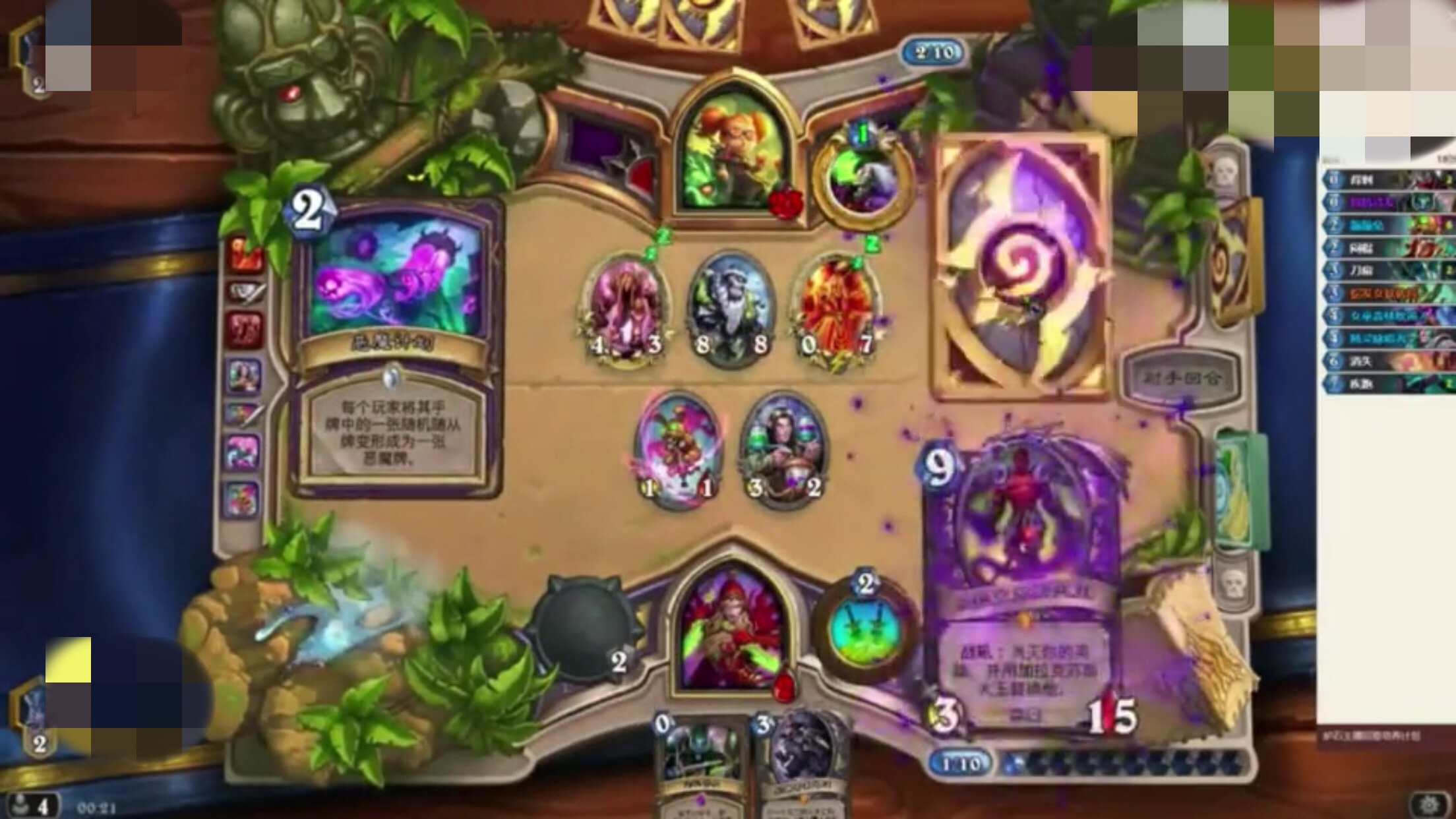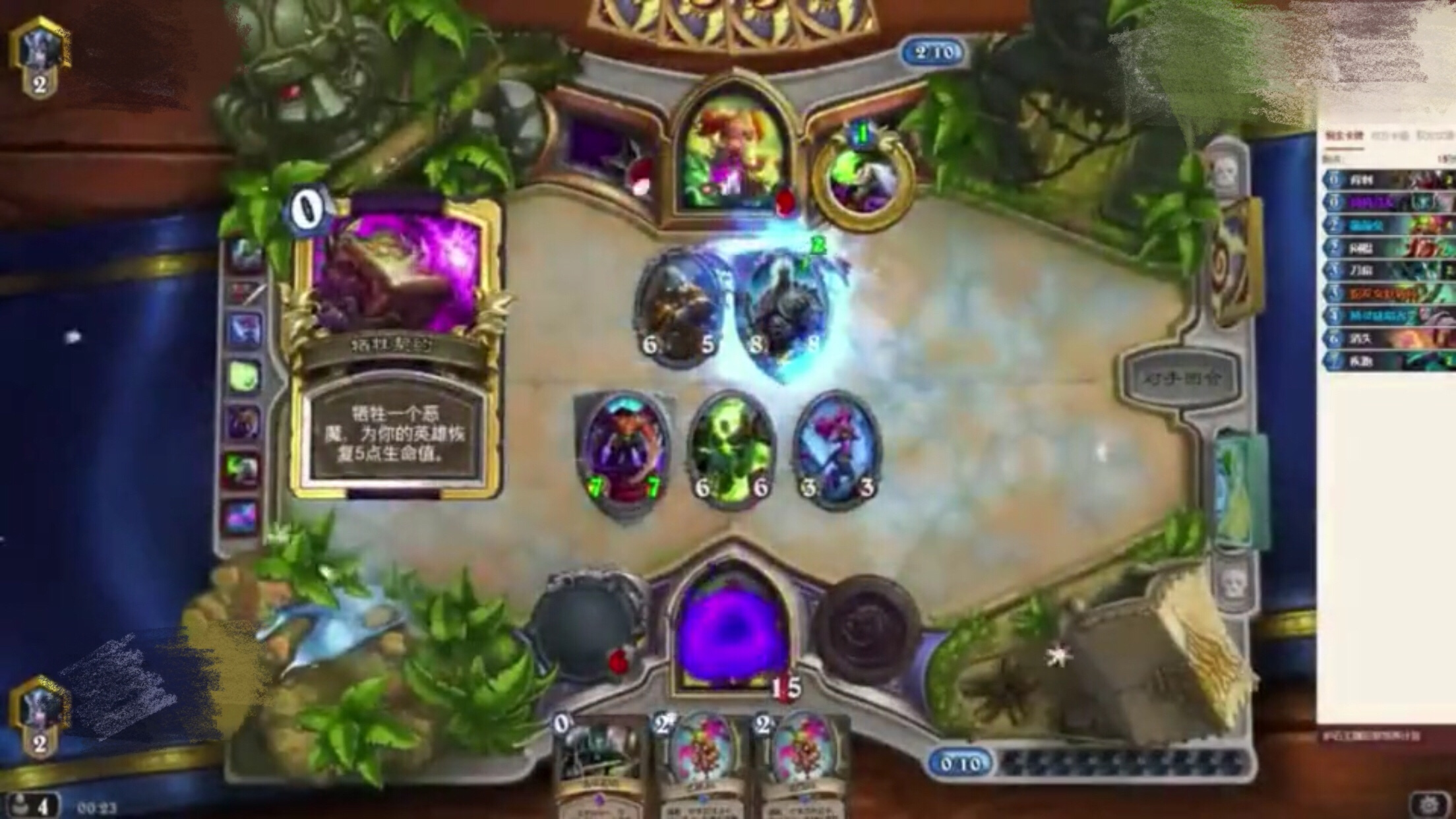 因为对战时忘记截图了,就用网络上的截图。这个是比较早的对局了。想当初在探险家协会之时,还没有开始退环境,收割机还是4费最佳随从卡牌。在我玩动物园与对面拼杀到我只剩下3点血的时候,收割机解了对面的一个大怪,我原来算好抽一口还剩1血正好不死,但是不料,在我抽一口的同时,收割机也掉出英雄之魂,然后我就被一口3血地抽死自己了。