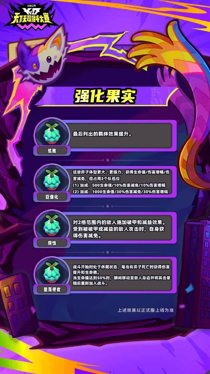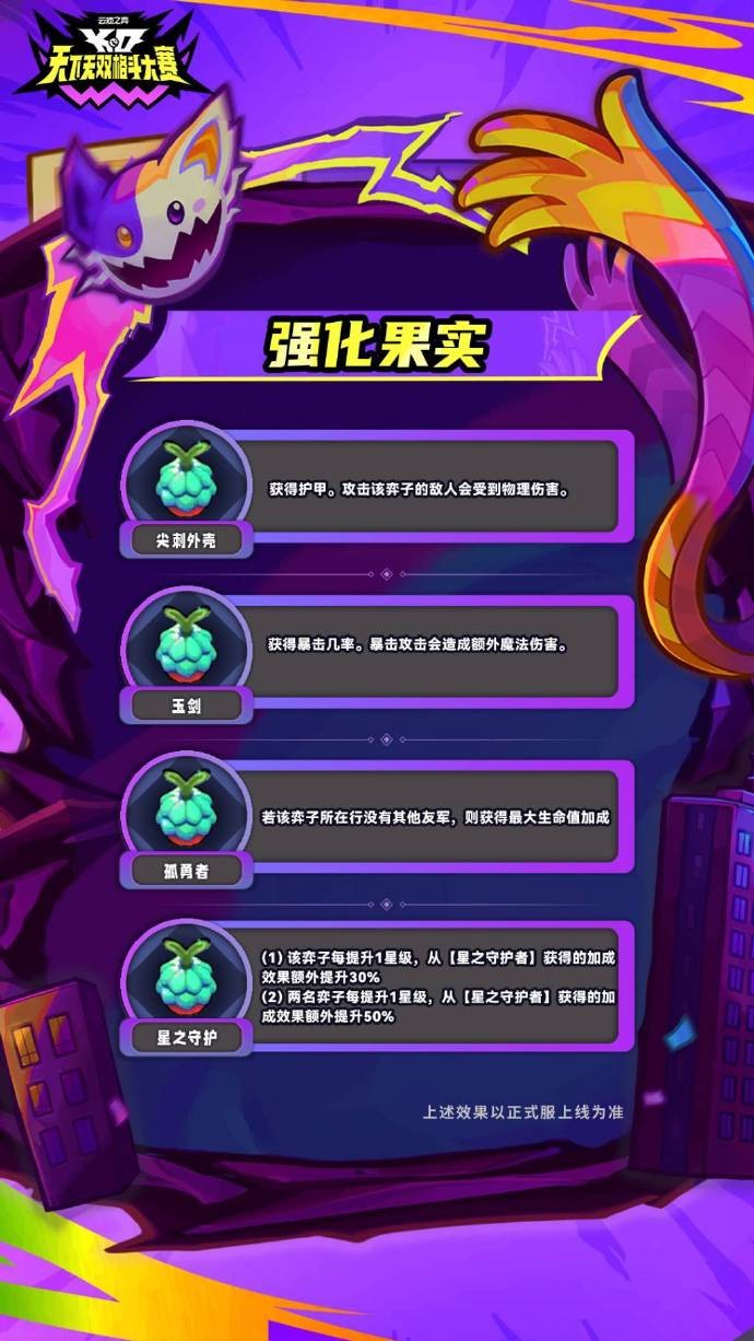 “强化果实”是这次的新机制。每局游戏的两个时间点——1-3 和 3-6,你将获得一个消耗品。你可以将它用于一个单位,从三个“选项”中选择其一。若该单位被售出,或你使用每个阶段可获得一次的“强化移除器”,该强化可以被返还。