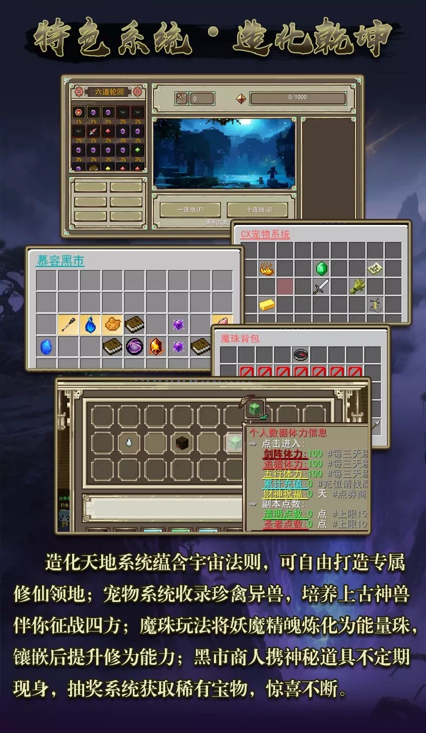 服务器玩法: 丨锻造丨历练丨功勋丨境界丨黑市丨五行饰品丨造化天地丨宠物丨图鉴丨纹章丨魔珠丨