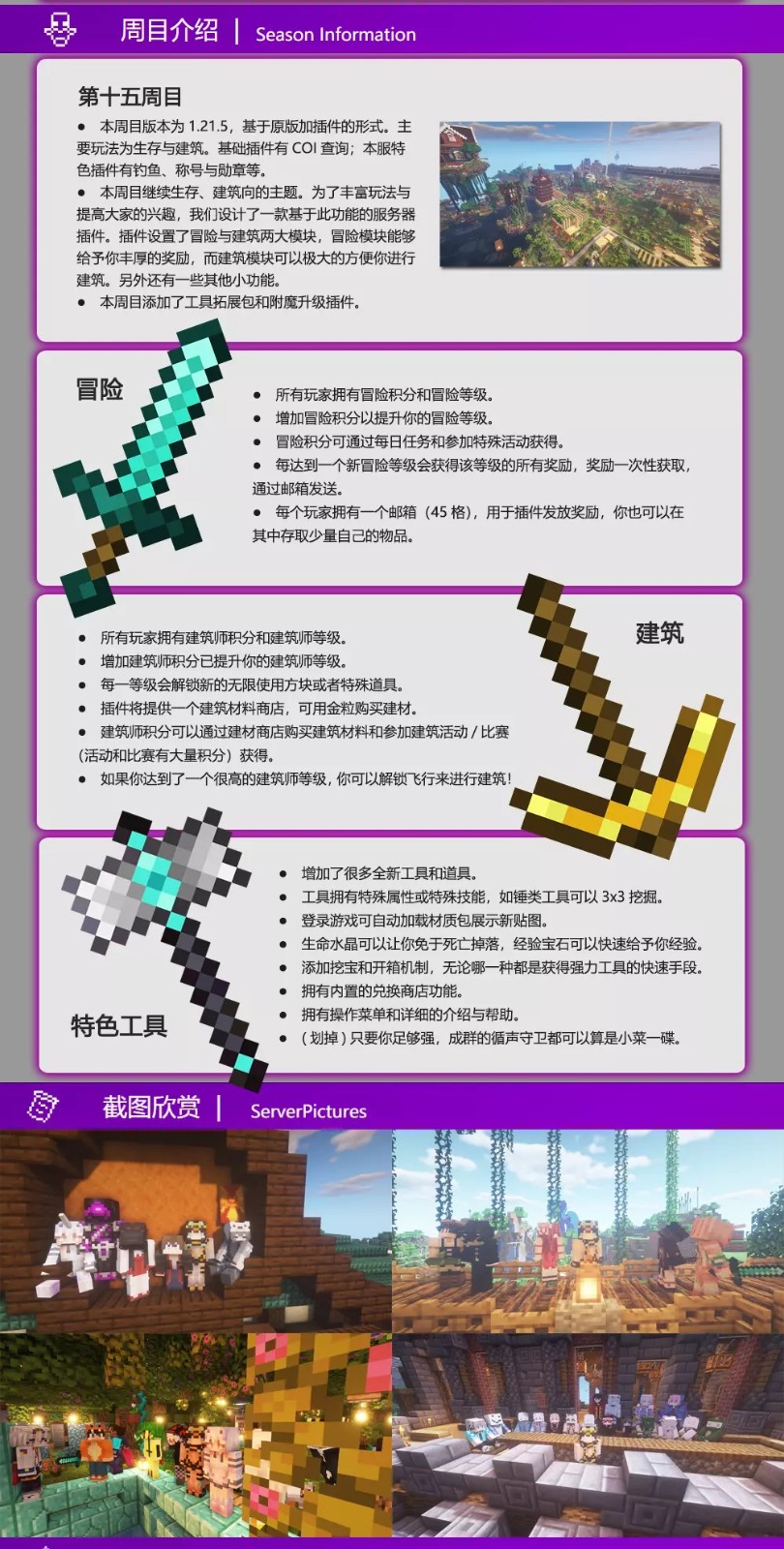 ● 本周目继续生存、建筑向的主题。为了丰富玩法与提高大家的兴趣,我们设计了一款基于此功能的服务器插件。插件设置了冒险与建筑两大模块,冒险模块能够给予你丰厚的奖励,而建筑模块可以极大的方便你进行建筑。另外还有一些其他小功能。