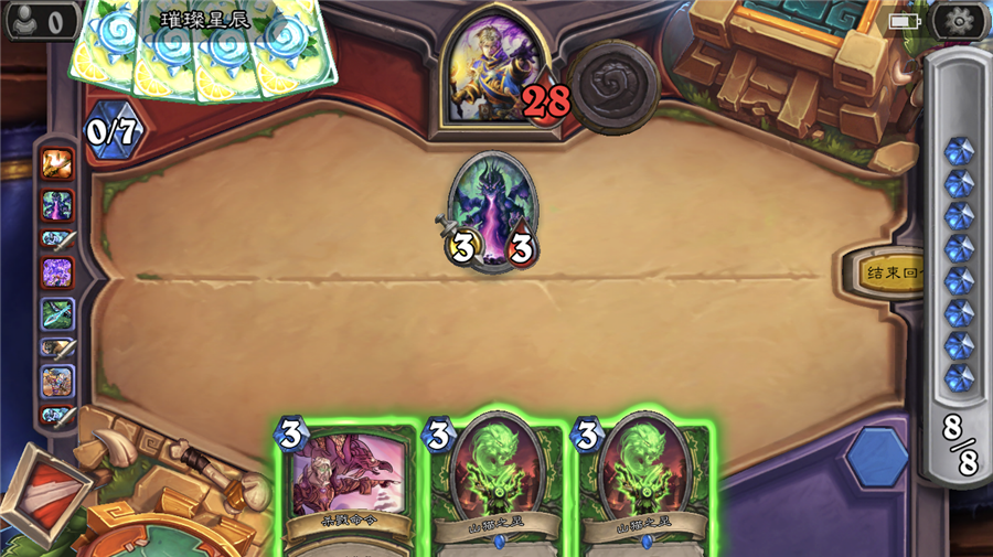 或许对于我来说想要胜利就需要遇到一个新手玩家!这把对局优先使用“疯入膏肓”给牌库的随从buff,然后使用655之后双方都是5费,对面6费直接2个“疯入膏肓”把水晶摧毁完了,我6费他0费我看呆了!
