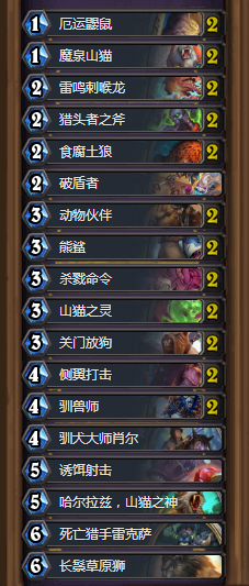 猎人的卡组还是一个冲脸的套路,整个卡组有铺场有武器还DK的后期还有类似放狗土狼的这些combo,稍微顺点基本没有哪个职业可以招架。同时还有肖尔的突袭效果和新橙卡山猫之神,请问我要怎么输?所以我也是我在乱斗中5把有3-4把猎人的原因吧,拿卡包就完事。
