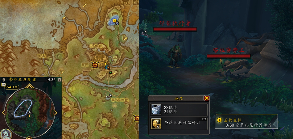 任务过程:接取任务后,前往(64,18)附近,击杀敌方目标并收集60个任务物品 “奈萨扎恩神器碎片”。