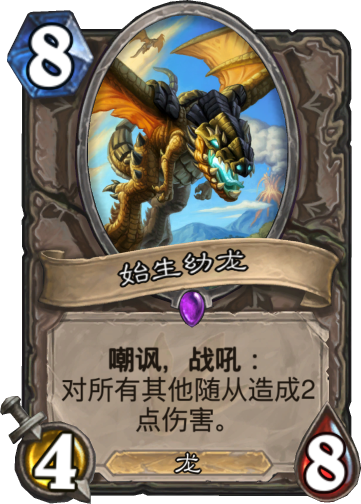 始生幼龙的出场率一直非常的高,在大多数慢速卡组中都起到非常重要的作用,特别是在德鲁伊的墙德卡组中,敌人面对不断复活的4-8始生幼龙,最后只能无奈投降。始生幼龙的战吼可以对全场造成两点伤害,可以用来清掉弱小的随从,也可以用来补刀,当然,再配上始生幼龙4-8附带嘲讽四攻大屁股的身材,清场的同时还能有效的护脸。
