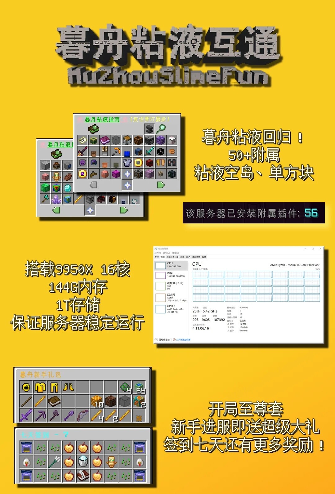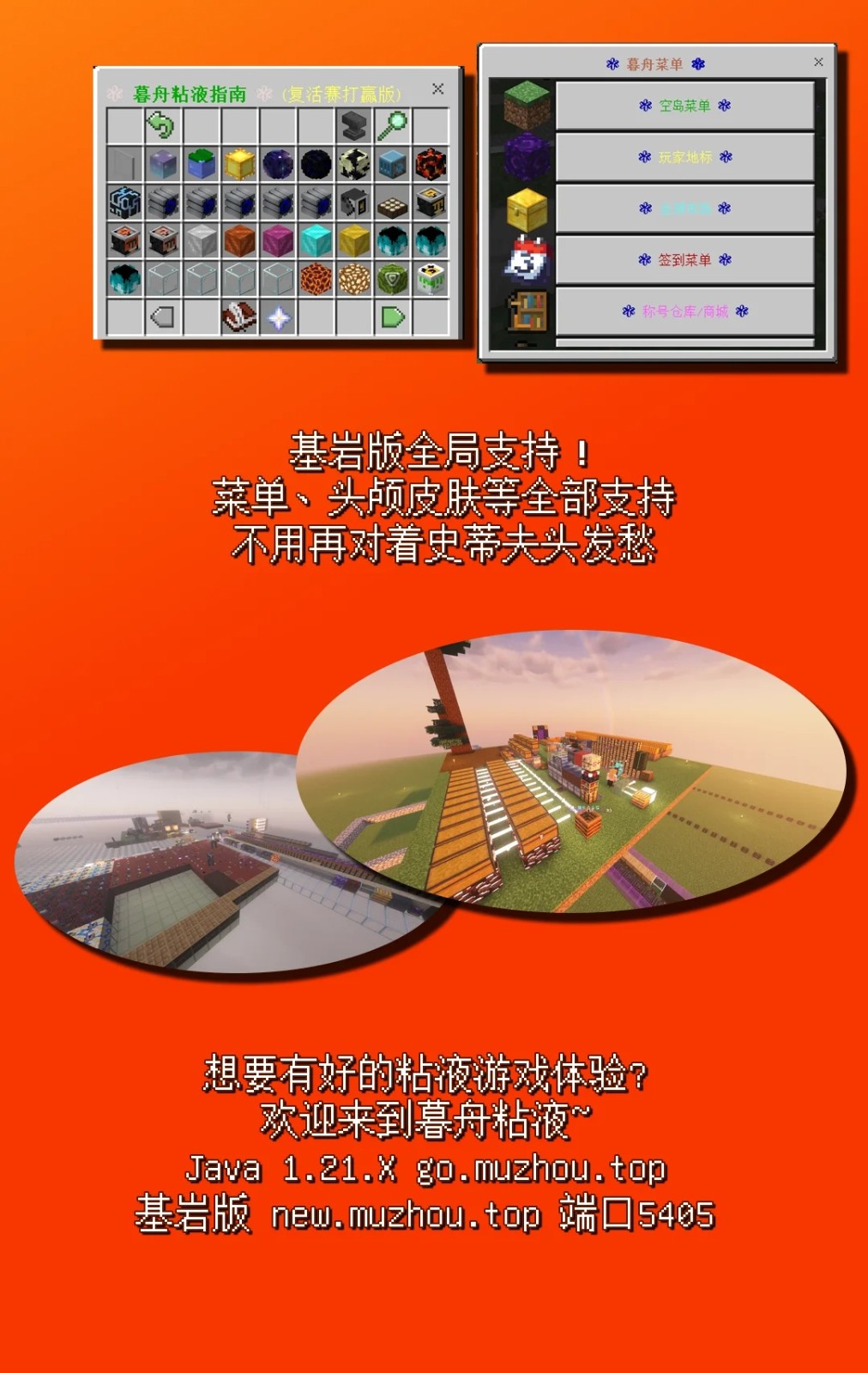 暮舟粘液——1.21.X|粘液|50+附属|超多福利|免费飞行|互通|头颅支持|空岛|趣味玩法|五年老服|全新周目