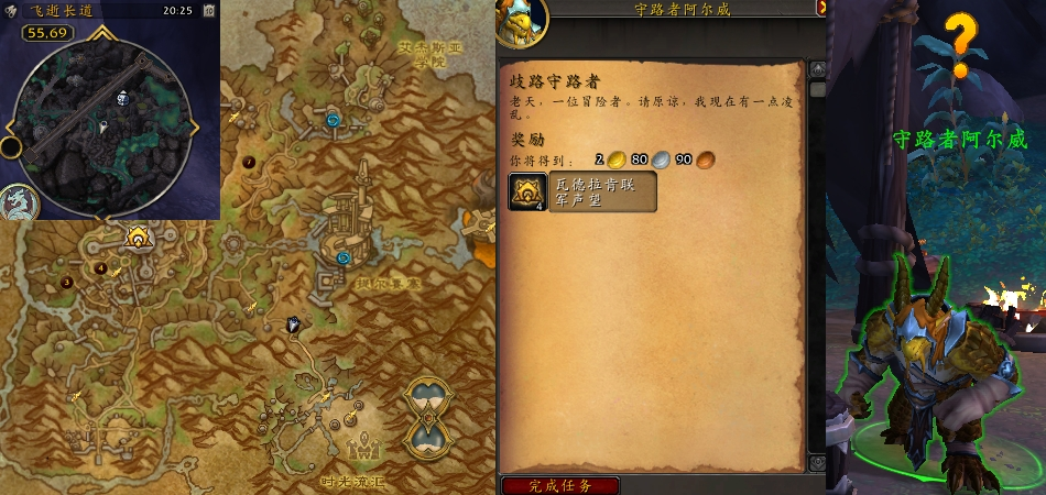 任务需求:在瓦德拉肯的飞逝长道(55,69)找到守路者阿尔威。