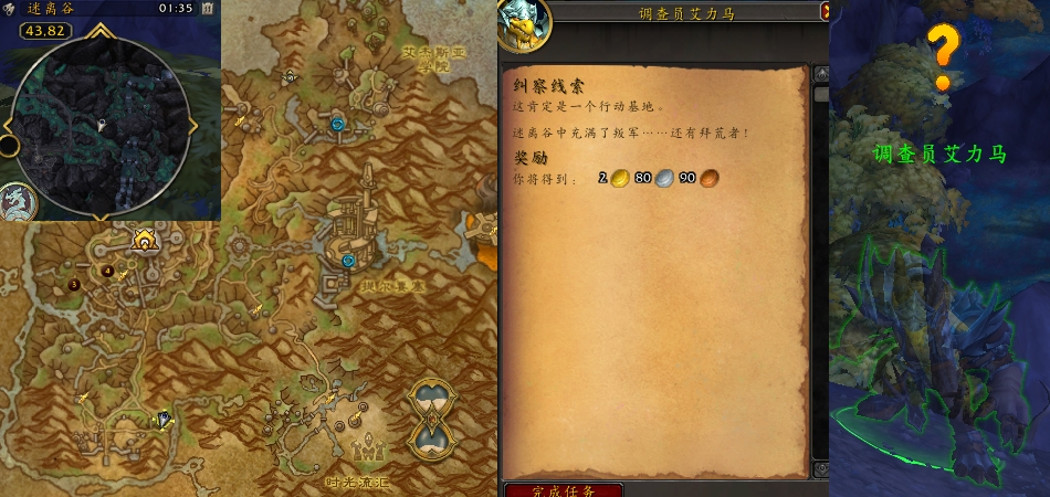任务过程:接取任务之后,前往索德拉苏斯-迷离谷找调查员艾力马(43,82)。