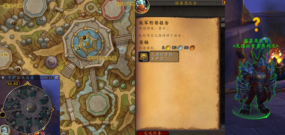 任务过程:接取任务之后,前往瓦德拉肯-守护巨龙之座顶层找德莱恩队长(56,40)。