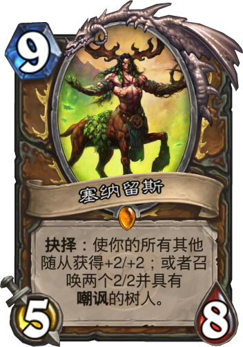 荒野之神塞纳留斯是德鲁伊经典卡包的九费橙卡,可以使得其他友方随从+2+2,也可以召唤两个2-2带有嘲讽的树人,前者配合铺场一波爆发,后期更适合空场上场,还有一定的护脸的能力,在不同的场合都能发挥出相应的作用。只可惜,塞纳留斯的费用实在太高了,九费一直是非常尴尬的存在,很难跟其他卡牌配合,况且现在版本的德鲁伊强势的卡牌太多了,根本没有留给塞纳留斯的空间。