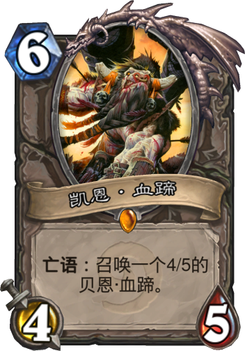 曾经,我们的老牛凯恩血蹄在很早之前的版本,拥有非常不错的出场率,六费4-5亡语还能召唤一个4-5,对面面对这个难缠的老牛,往往会显得比较被动。只是,凯恩血蹄只有四点的攻击对于一个六费随从来说,略有一些尴尬,攻击性不足,对面完全可以无视这个皮糙肉厚还带亡语的随从,要么清其他的所从,要么直接走脸,根本就不用搭理。