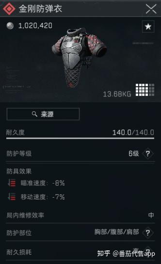 金刚是唯一没啥优点的六甲,耐久是六级甲中第二高为140,减少8%瞄准速度和7%的移动速度。