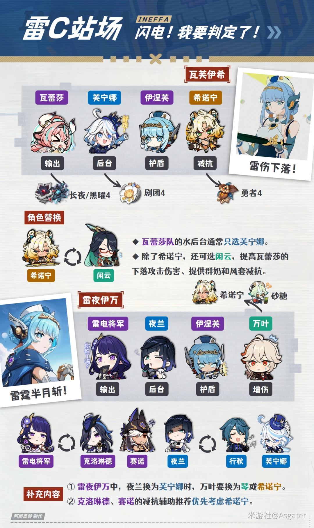 ③ 该玩法的组队公式常是“站场雷C+伊涅芙+水后台+增益/减抗位”。