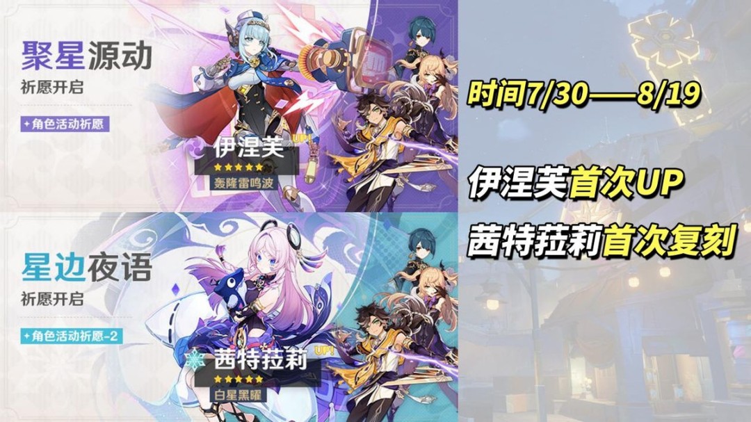 伊涅芙、茜特菈莉、赛索斯、行秋、菲谢尔。其中伊涅芙配合本期4星角色可直接构成完整的1金4人队伍,茜特菈莉则需搭配你自身持有的其他角色组队了。