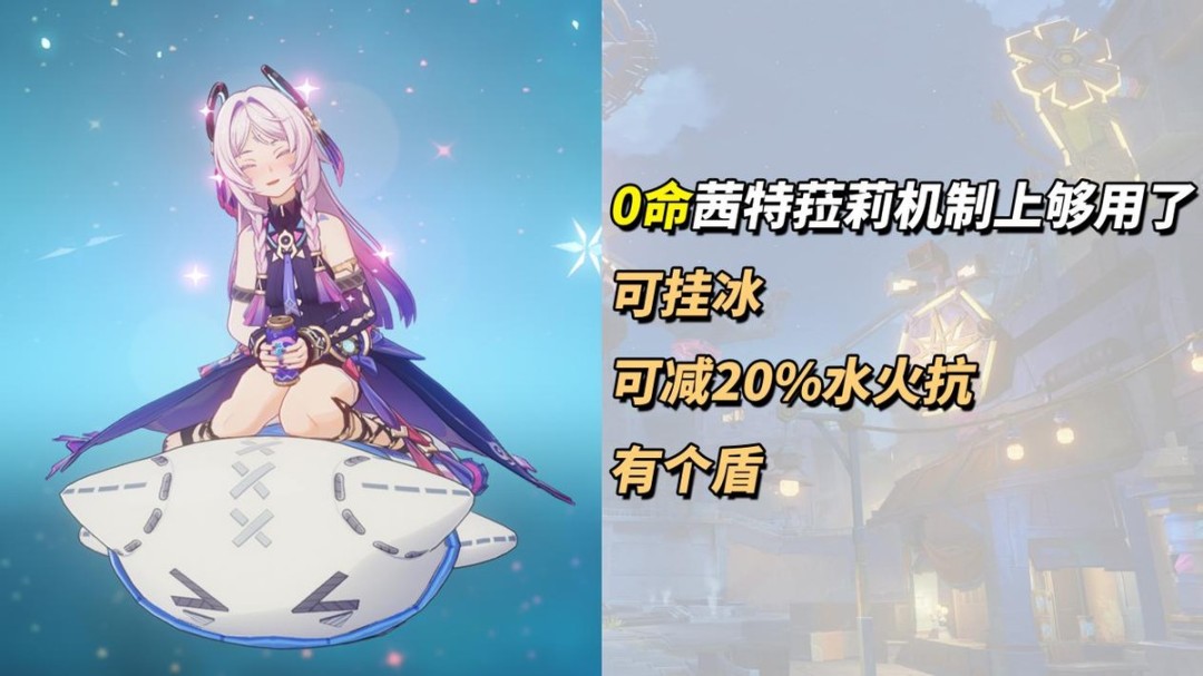 若你配队需要茜特菈莉但原石不咋多,个人推荐拿下00即可,毕竟角色基础机制已经提供了20%水火减抗与持续的范围挂冰机制,是完全够用的。