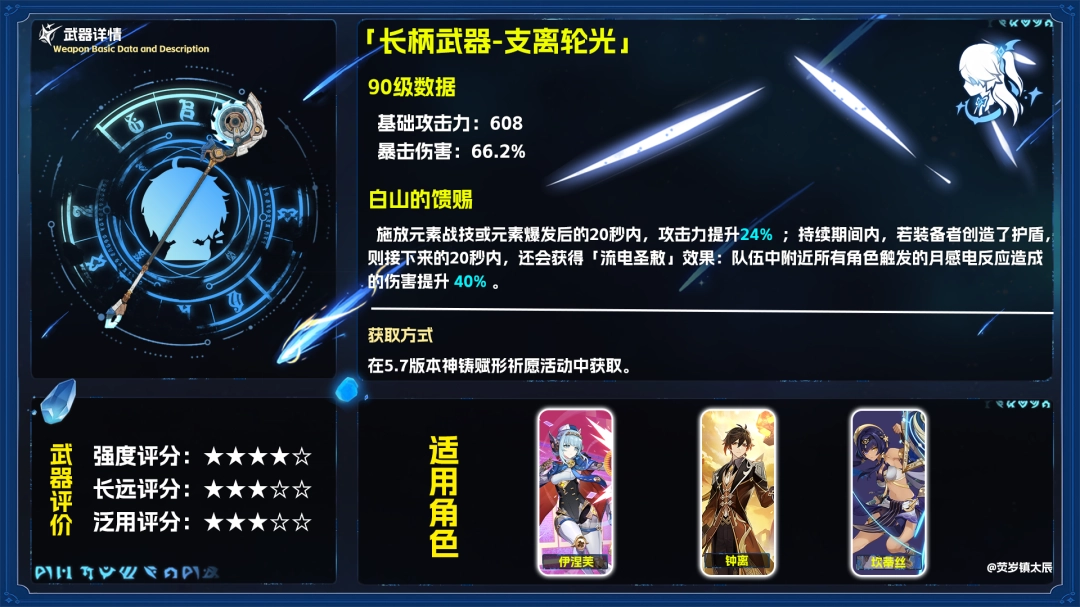 从面板数据来看,支离轮光是辅助向的长柄武器,尤其在月感电反应的增益上有所长处。