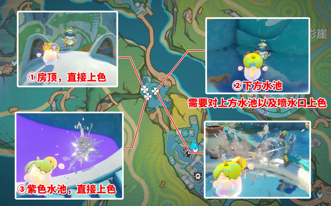 所以我们需要到上方水池,对水池及其喷水口上色,让水流变色即可
