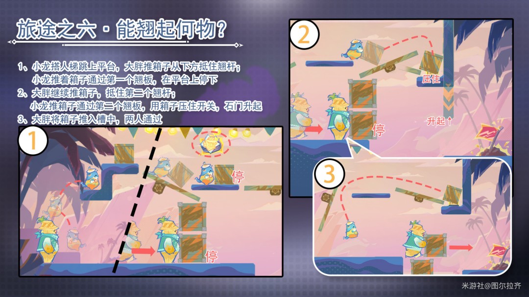1、小龙搭人梯跳上平台,大胖推箱子从下方抵住翘杆;小龙推着箱子通过第一个翘板,在平台上停下。