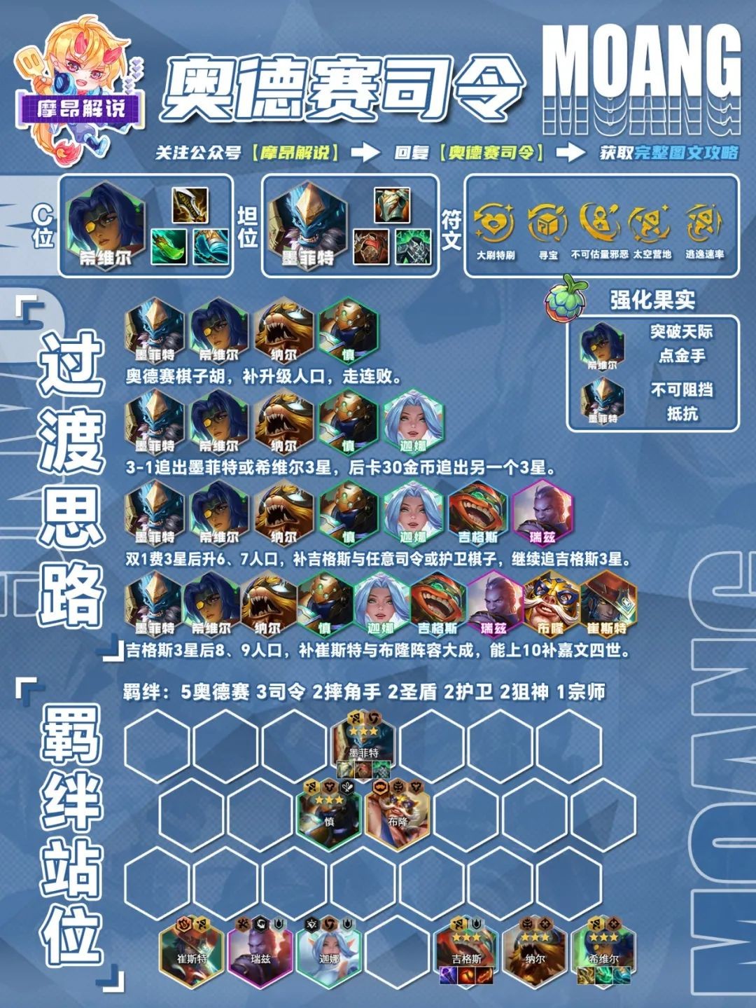 阵容属于多棋子赌狗阵容,但不需担心,只要开局奥德赛棋子比较胡,如希维尔、墨菲特来的比较多且第一个符文需要有经济D卡类的就能考虑冲。