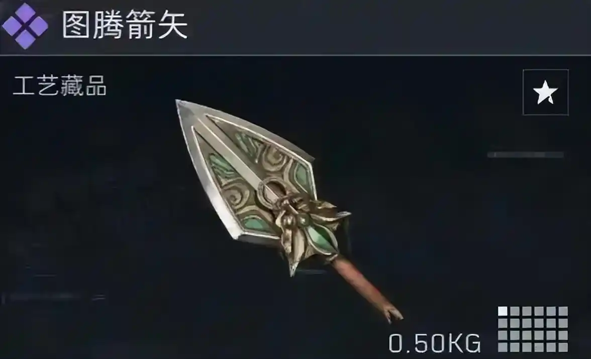 图腾箭矢,本次更新的唯一紫色工艺藏品,1格,价值在1.5万左右,主要在航天基地和长弓溪谷产出。