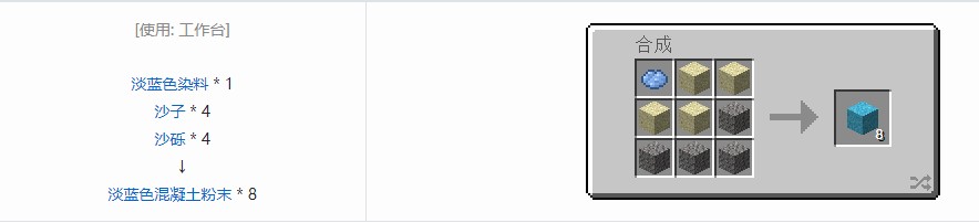 我的世界游戏里面的淡蓝色混凝土粉末制作方法:需要材料1个淡蓝色染料+4个沙子+4个沙砾可以获得8个淡蓝色混凝土粉末,如果混凝土粉末在降落时从侧面经过水,它不会凝固。