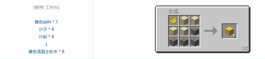 我的世界游戏里面的黄色混凝土粉末制作方法:需要材料1个黄色染料+4个沙子+4个沙砾可以获得8个黄色混凝土粉末,如果落在侧面邻近水或熔岩的位置,它只会在方块更新之后凝固。