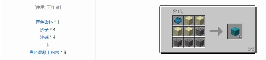 我的世界游戏里面的青色混凝土粉末制作方法:需要材料1个青色染料+4个沙子+4个沙砾可以获得8个青色混凝土粉末,如果混凝土粉末在降落时从侧面经过水,它不会凝固。