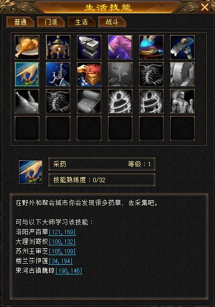 学习采药之后就可以去野外采集药材了,采药可以获得各种药材以及伴生药材,这些可以作为制药或者各门派特殊生活技能的原料。当然某些时候有些任务也会偶尔需要一些药材。