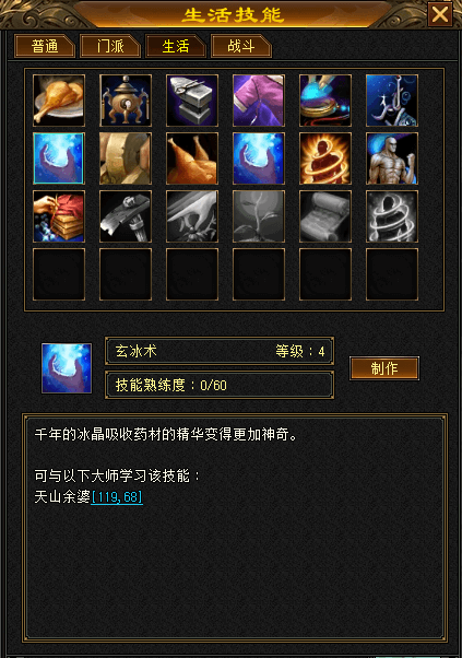 玩家角色等级≥10级即可在【修行书】-【日常活动】-【活力换钱】中的最后一个【玄冰术】,点击【前往】即可自动前往门派传授制作术处学习(不同门派技能名称不同)。