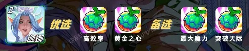 迦娜优先推荐高效率,黄金之心,备选最大魔力,突破天际。