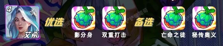 艾希优先推荐影分身,双重打击,备选亡命之徒,秘传奥义。