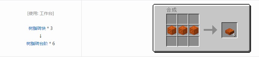 我的世界游戏里面的树脂砖台阶合成方法:需要材料3个树脂砖块可以获得6个树脂砖台阶,可使用3个对应方块合成获得或使用1个对应方块在切石机切石获得。